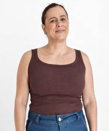 Regata confeccionado em malha Canelado Premium na cor beringela, decote U, cavado.