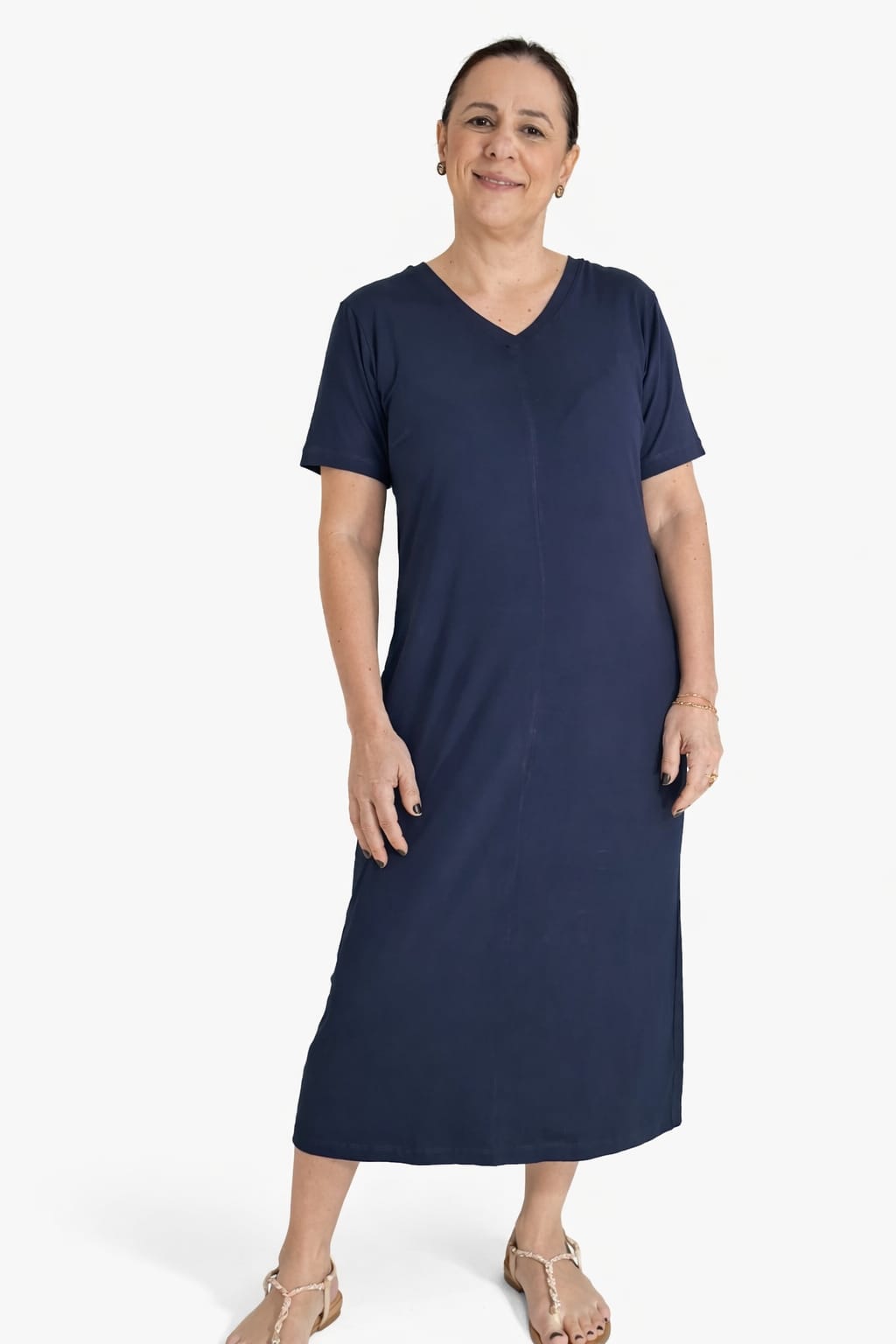 Vestido confeccionado em malha Viscolycra Premium na cor Azul Marinho, golja V, com mangas curtas.